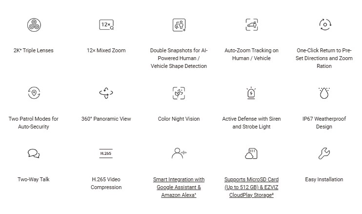 The H80f Multi, EZVIZ‘s first triple-lens outdoor camera, is designed to provide exceptional outdoor security with unseen professionalism. The integrated capability of three powerful 2K+ lenses allows the camera to capture a wide view and close-up details simultaneously, supported by an incredible, non-blurry 12-times zoom. Its embedded AI can effectively detect and lock on both people and vehicles to record an ongoing activity from left to right, while you receive more informative mobile alerts accompanied by double snapshots of both the visitor and the car.
